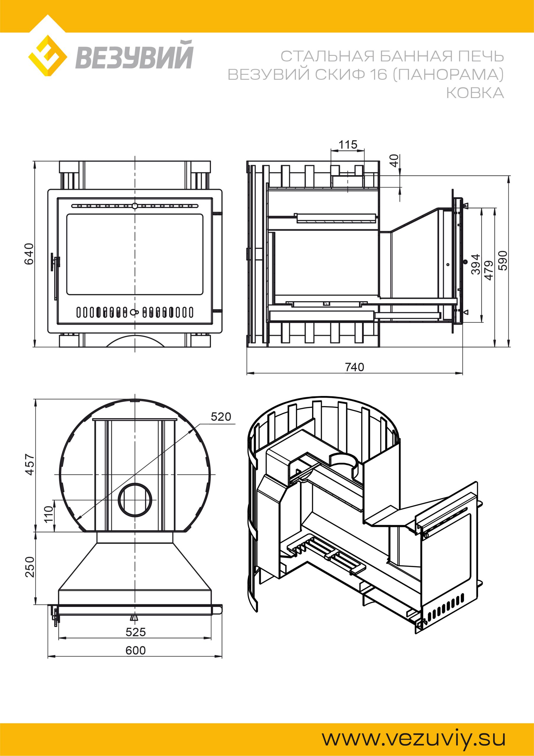 Стальная банная печь ВЕЗУВИЙ Скиф 16 Панорама Ковка предназначена для прогрева парного помещения в бане и поддержания необходимой температуры во время парения.Печь СКИФ оборудована открытой каменкой, закладываемой камнями для бани (приобретаются отдельно).Печь изготовлена из особо прочной котловой стали 09Г2С, рассчитанной на работу при высоких температурах и давлении. Толщина стенок печи 4-6 мм.Топочный тоннель также выполнен из стали марки 09Г2С толщиной 4 мм, что позволяет топить дрова длиной более 50 см.Топка оснащена каналом для подачи воздуха на вторичный дожиг дымовых газов. Канал проходит по задней стенке топки снизу вверх и подаёт воздух для горения в верхние отделы топки. Такая конструкция повышает экономичность печи и увеличивает КПД агрегата.