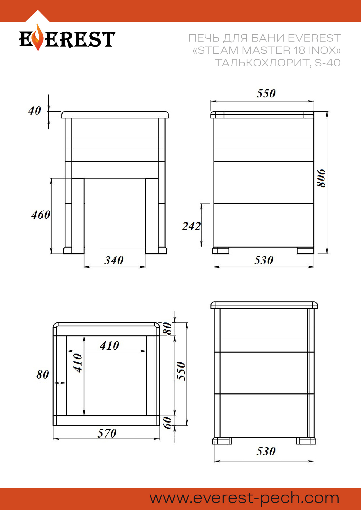 Печь для бани Эверест «Steam Master 18 INOX» Талькохлорит, S-40 изготовлена из нержавеющей стали. Печь предназначена для установки в частные и коммерческие бани с объёмами парных помещений до 18 м³.