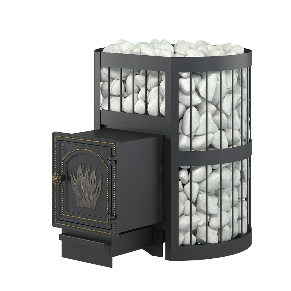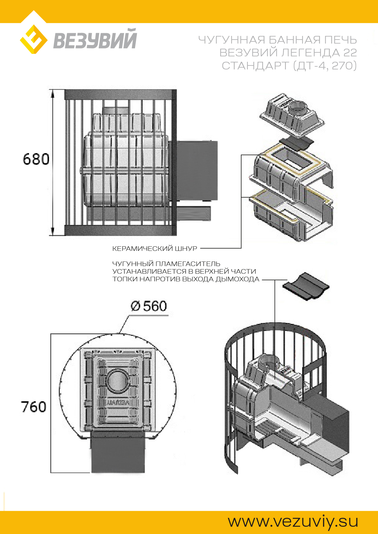Банная чугунная печь Легенда Стандарт 22 (ДТ-4) укомплектована чугунной не герметичной дверцей Везувий ДТ-4. Конвекционно-вентилируемый кожух «Стандарт» изготовлен из металлического прутка диаметром 6мм покрашенной черной термостойкой краской.