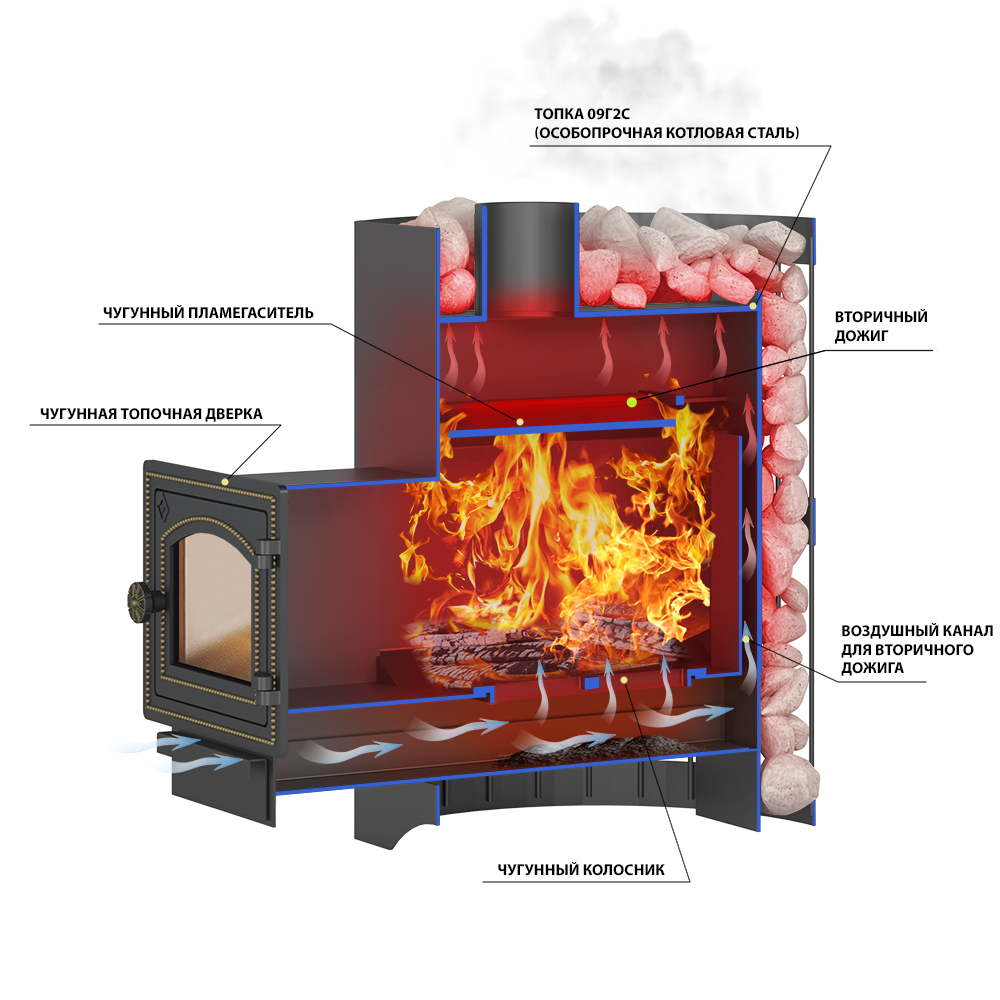 Топка оснащена каналом для подачи воздуха на вторичный дожиг дымовых газов. Канал проходит по задней стенке топки снизу вверх и подаёт воздух для горения в верхние отделы топки. Такая конструкция повышает экономичность печи и увеличивает КПД агрегата.